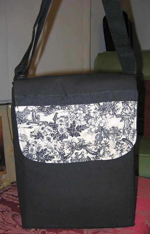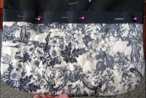 I decided, after the main body of the bag was complete, that I wanted to change the look of the flap. I made a sort of pouch out of some of the toile and pinned it over the edge of the flap: