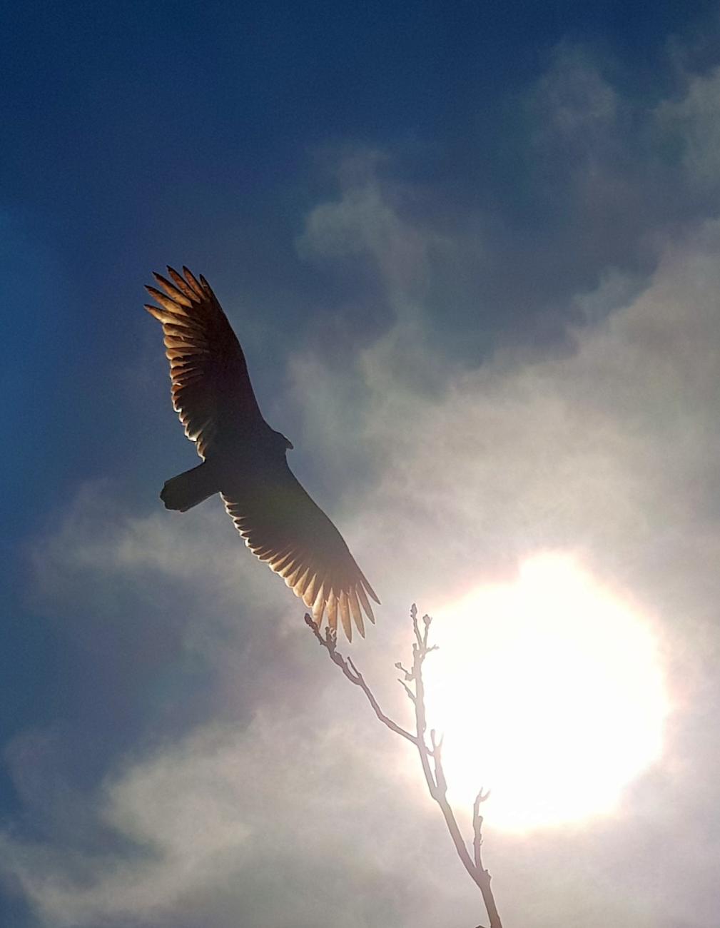 Took this photo of a Turkey Vulture today, with the Samsung Galaxy Note 8's built in zoom lens. This was then cropped, but still. It wasn't many years ago that phone cameras were a complete joke! This bird was part of a small group, gliding on updrafts of wind that came up a steep mountainside. These wonderful updrafts are conveniently located on a ridge above a moderately busy four-lane road that has forest above and below it. Pretty much the perfect hunting spot for vultures. Still; watching them glide about is fascinating.